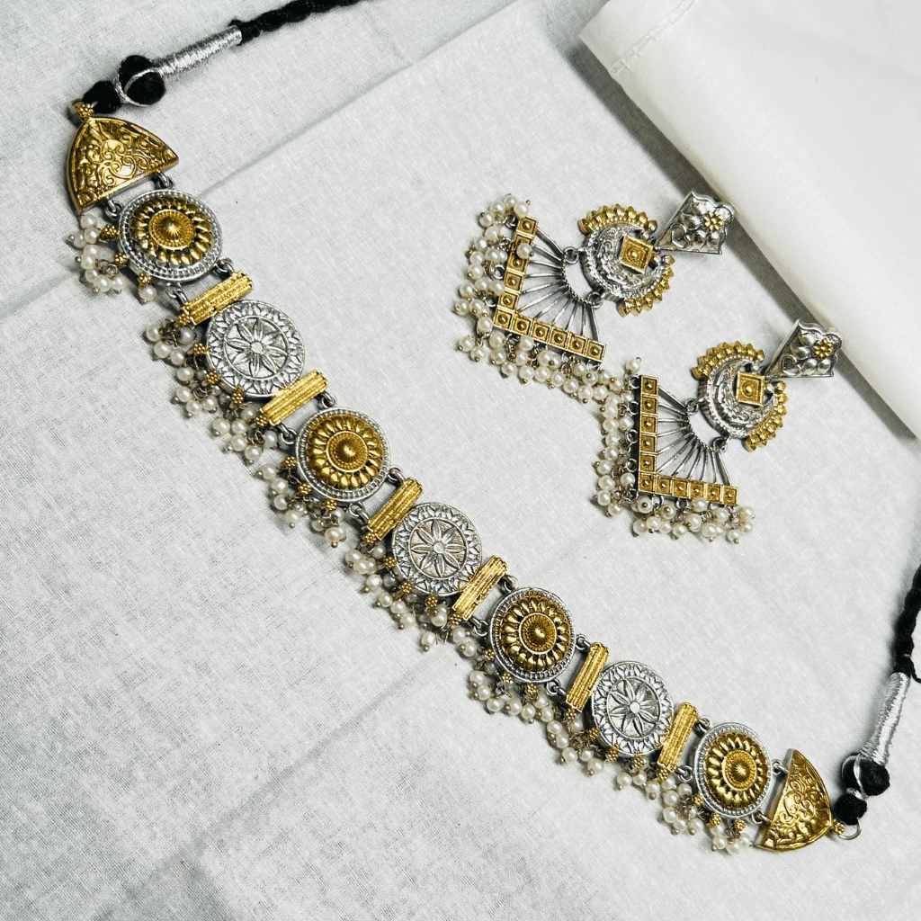 Celebrate the harmony of contrasting metals with the Chandni Choker. This set features a sophisticated sequence of circular medallions, alternating between sun-kissed gold and rustic silver finishes. Bordered by a lush fringe of tiny seed pearls, it is a timeless masterpiece designed for the woman who loves jewelry that bridges the gap between traditional and contemporary.