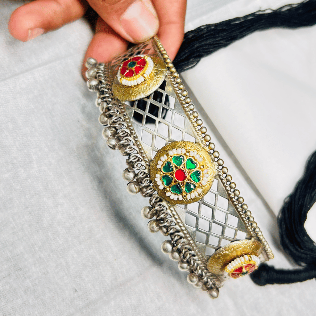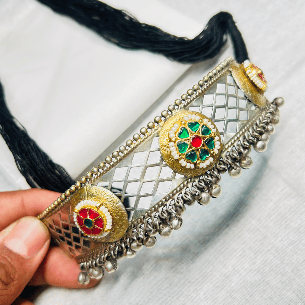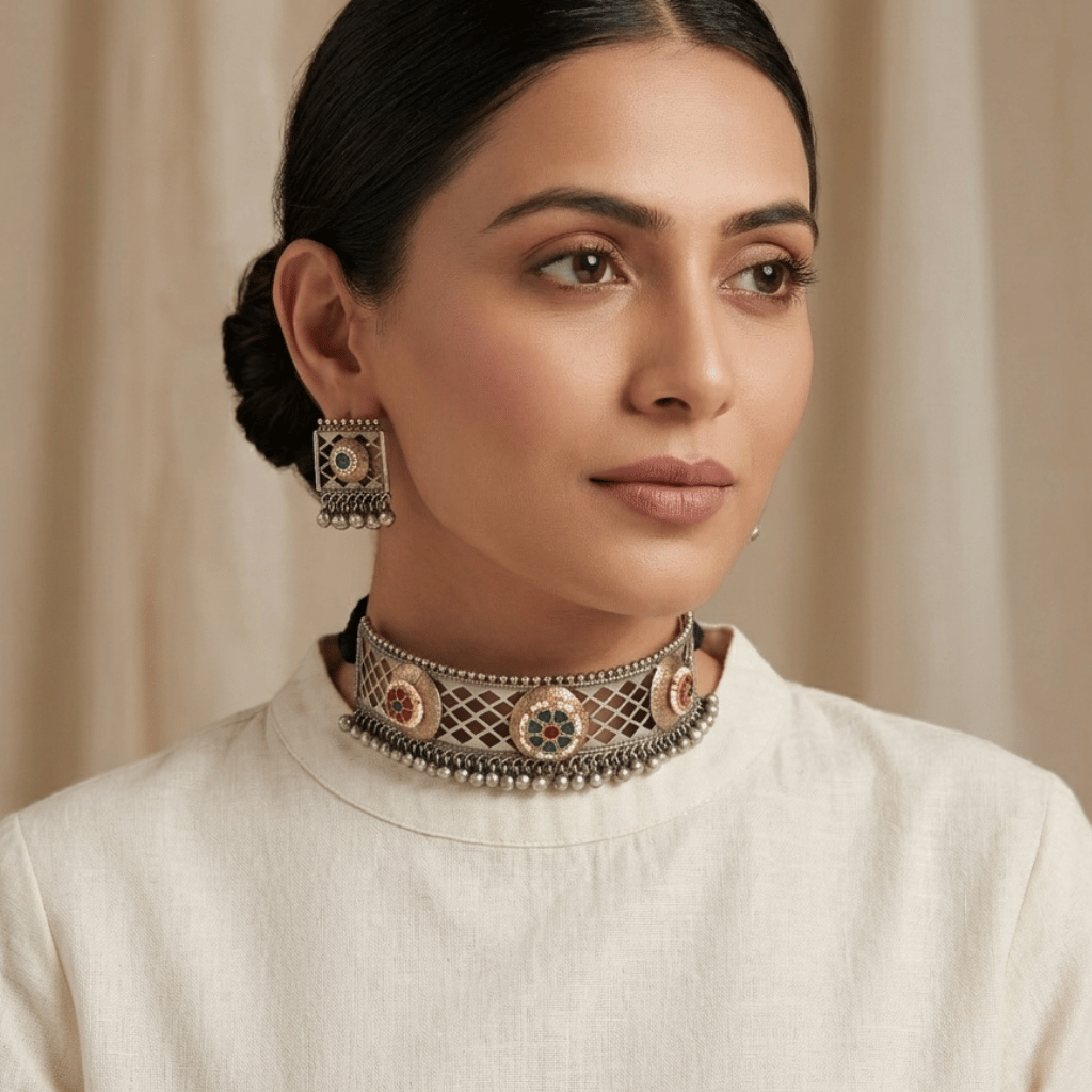 Exude a sophisticated, vintage charm with the Jali Mesh Choker. Inspired by the intricate stone carvings of royal Indian architecture, this set features a beautiful open-work lattice frame. Accented by colorful floral medallions, it is designed for the woman who loves jewelry that is both bold in structure and delicate in detail.