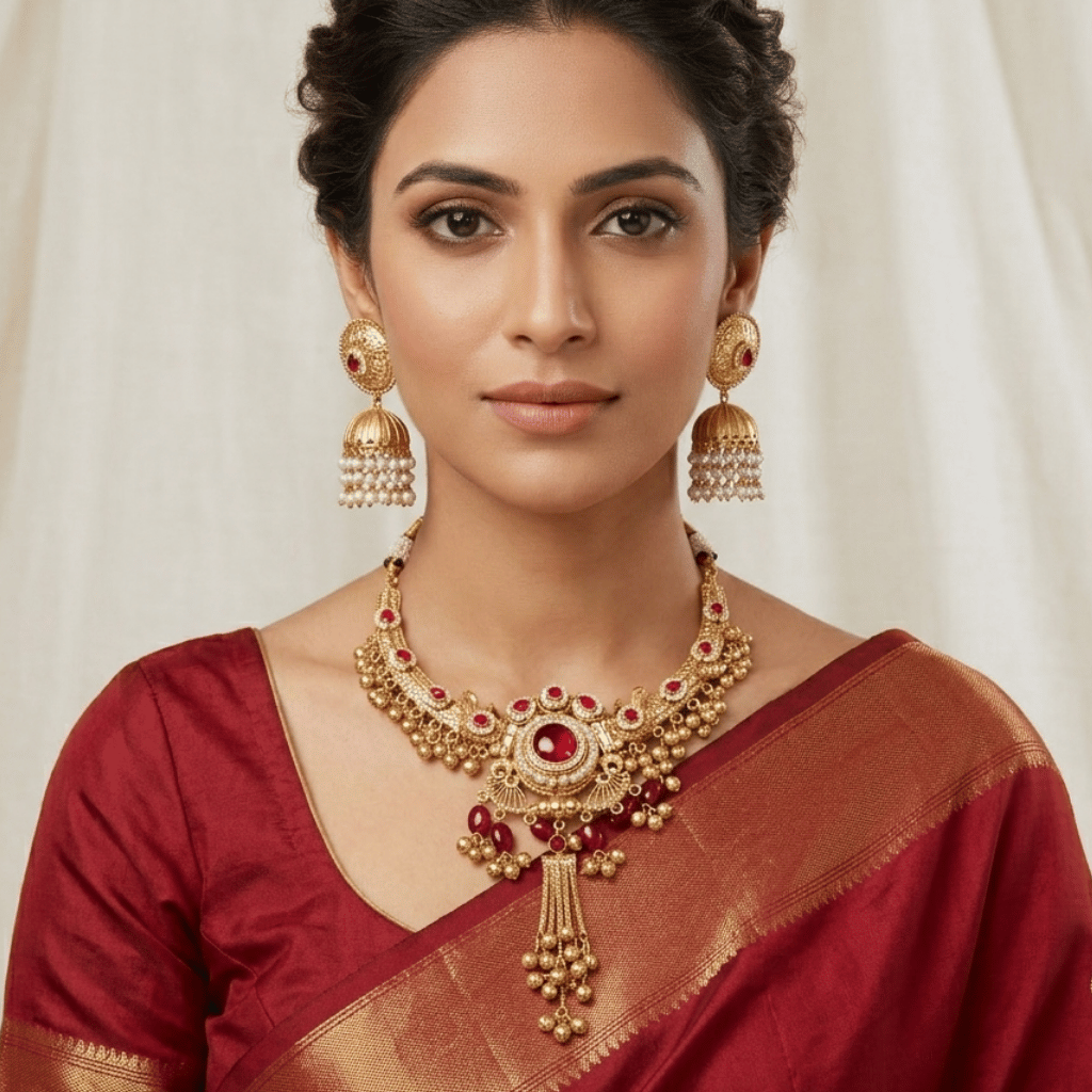 Ignite your festive spirit with the Rohini Ensemble. A celebration of classic Indian opulence, this set features a majestic central medallion accented by a cascading tassel of golden beads. It is a masterpiece designed for the woman who loves the timeless combination of ruby-red brilliance and rich antique gold.