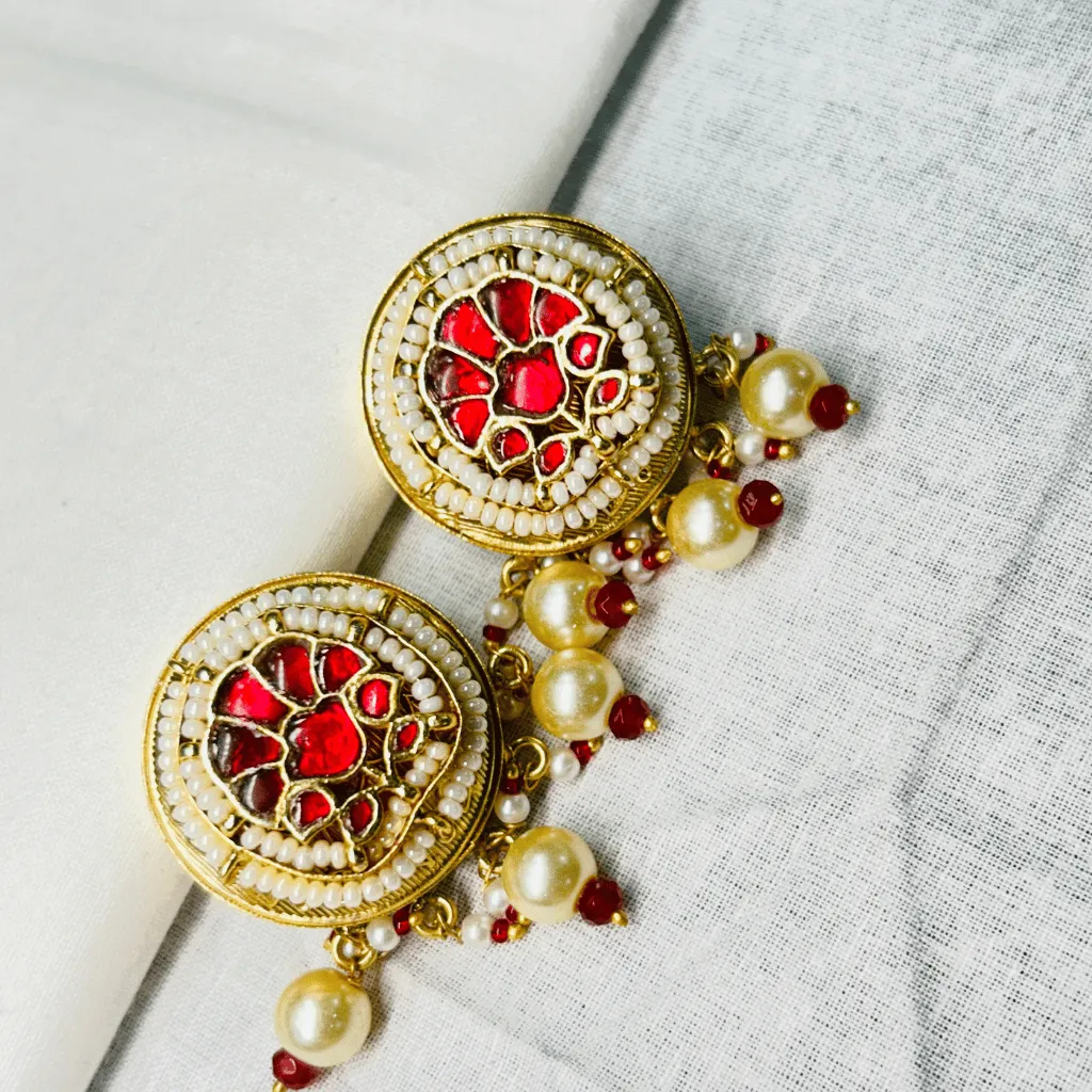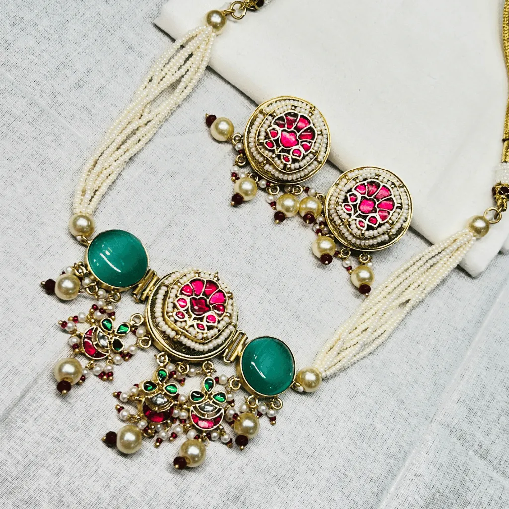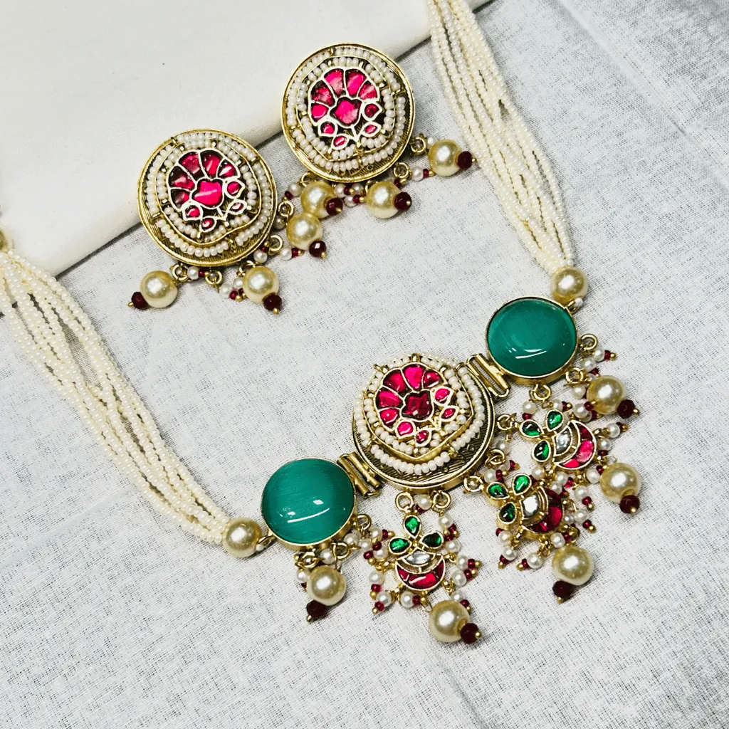 Celebrate the fusion of contemporary vibrance and traditional elegance with the Vrinda Set. Designed for the woman who loves a pop of regal color, this necklace features a bold interplay of emerald hues and ruby-pink kundan work, making it a standout masterpiece for your jewelry chest.