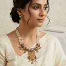Make a royal entrance with our signature long-form Haar. This piece captures the opulence of traditional Indian temple jewelry, featuring a grand ornate pendant suspended by five luxurious strands of micro-pearls. Available in two distinct color stories to match your personal style.