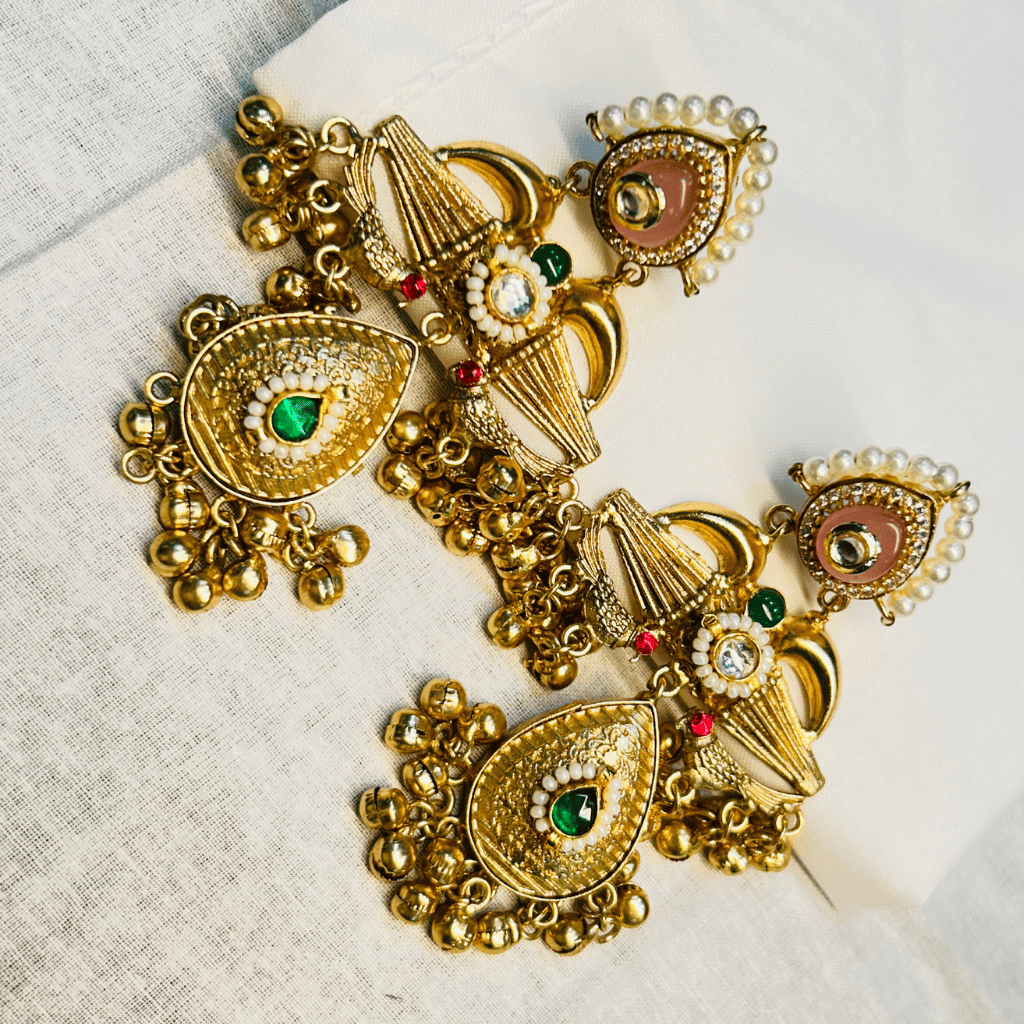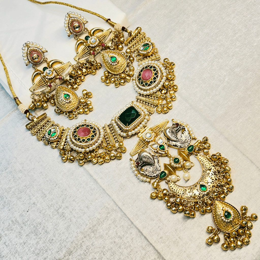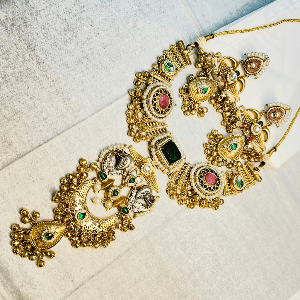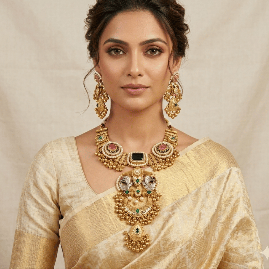 Embody the majesty of an empress with the Samragni Heritage Haar. This grand statement set is a masterpiece of storytelling, featuring a cascading pendant that intricately weaves together symbols of prosperity and grace. Handcrafted with a rich antique-gold finish and highlighted by dual-tone accents, it is the ultimate centerpiece for a bridal or high-festive trousseau.
