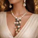 Make a statement of unparalleled grace with this handcrafted Polki necklace. Featuring a dramatic cascading design of brilliant uncut stones and rich emerald accents, this set reimagines heritage motifs with a modern, minimalist edge. Its intricate craftsmanship and fluid drape offer a luxurious feel, making it the ultimate centerpiece for a high-fashion wedding or engagement look.