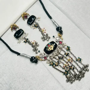 • Handcrafted Oxidised Silver Statement Set with Oval Stone Tassels Handcrafted Oxidised Silver Statement Set with Oval Stone Tassels